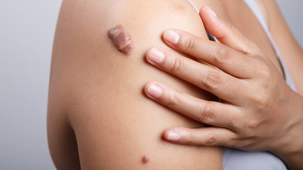 Keloids are raised scars on a patient’s skin that develop after an injury has healed. Most keloids are present on a person’s back, shoulders, chest, or earlobes, as keloids tend to form due to surgery, piercings, and/or acne cysts. Keloid scars are made up of irregular fibrous tissue that grows beyond the area of the skin that has experienced injury or incision. Keloid scars tend to be rare, affecting about one in ten patients, and people often don’t know they are at risk for forming them until one has developed. A keloid can be problematic for patients due to its effect on the color and pigmentation of their skin. In addition, these scars can cause pain and discomfort with symptoms of redness, itchiness, and uncommon sensation.